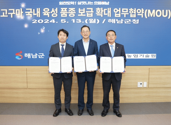 명현관 해남군수와 국립식량과학원 곽도연 원장, 전라남도농업기술원 박홍재 원장, 각 기관 관계자들이 참석한 가운데 열린 업무협약식에서는 해남고구마의 품질 경쟁력 향상을 위해 고구마 신품종의 품종 육성과 재배기술 개발 등에 유기적 협력체계를 구축해 나가기로 했다.