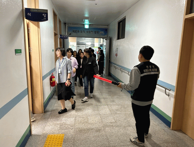 이날 오후 2시에 훈련 공습경보가 발령되자 관계 직원들은 안내요원의 유도에 따라 신속하게 1층 구내식당 대피소로 대피했다.