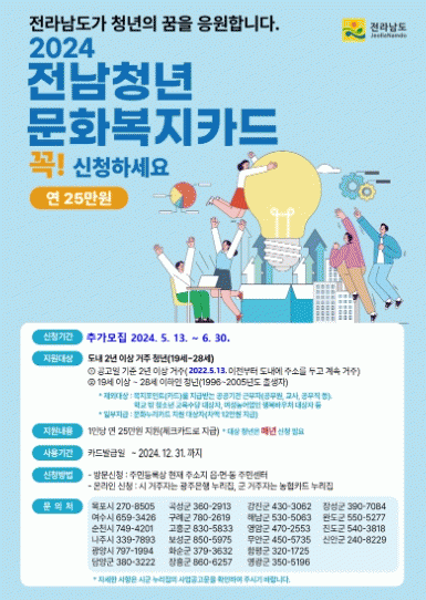 전남청년 문화복지카드 지원사업은 도내 청년들에게 연 25만원의 문화복지비를 체크카드 포인트 형태로 지원하는 사업으로 청년들은 공연 관람, 학원 수강, 여행, 체육시설 이용 등을 도내 지정된 가맹점에서 포인트를 사용하여 즐길 수 있다.