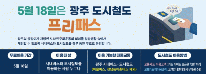 이번 5·18 무료 승차는 광주 시내버스와 도시철도에 적용되며 마을버스나 전남농어촌버스 등은 해당되지 않는다.