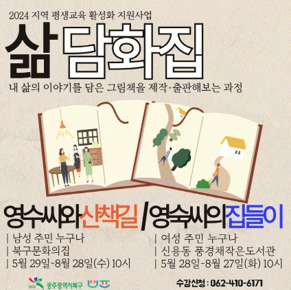 여성과 남성 과정이 각각 개설되는 이번 프로그램은 풍경채 작은도서관에서 여성 대상 ‘영숙씨의 집들이’ 과정이 북구문화의집에서는 남성 대상 ‘영수씨와 산책길’ 과정이 진행될 예정이다.