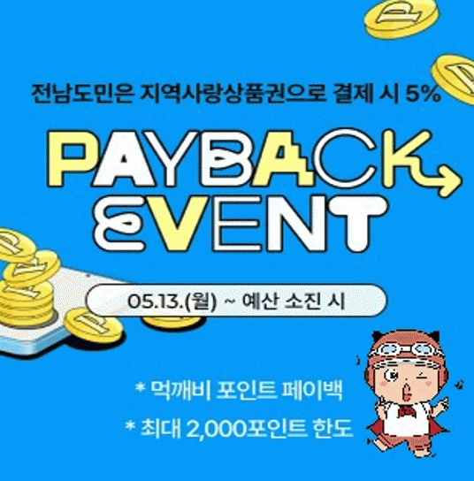 포인트 지급은 먹깨비 결제일 기준 다음 주 월요일에 지급되며, 주문 건수 1회에만 제한해 지급되는 것이 아니라 먹깨비 내에서 지역사랑상품권으로 주문?결제할 때마다 페이백을 받을 수 있다.