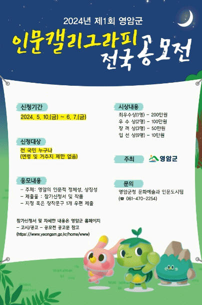 공모전은 ‘달빛생태문화도시 영암’ ‘마한의 숨결이 살아 숨쉬는 달빛도시 영암’ ‘진리가 샘물처럼 솟아나는 월출산 구정봉’ 등 지정 문구나 참여자의 창작 문구를 50×70cm 또는 70×50cm 크기의 종이에 손글씨로 자유롭게 표현한 캘리그라피 작품 1점과 참가신청서를 우편 제출하는 방식으로 참가할 수 있다.