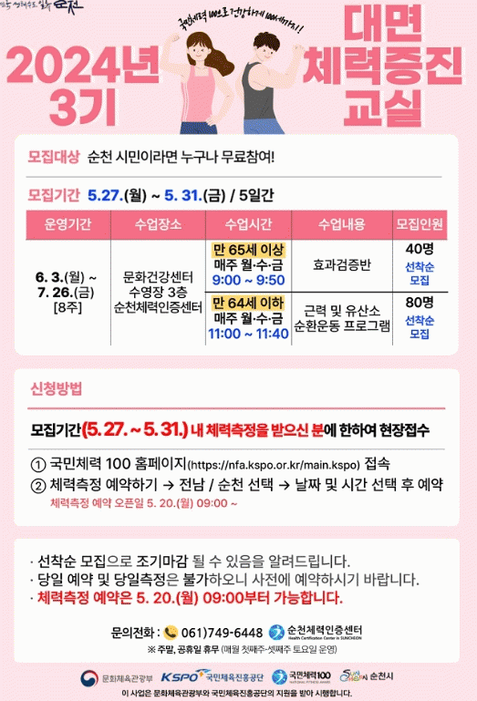 체력증진교실 모집 및 센터 이용 문의는 순천체력인증센터로 하면 된다.