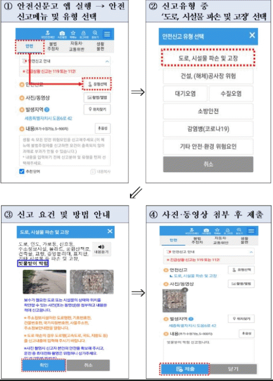 ‘빗물받이 막힘 집중 신고’는 생활 속 위험요소를 누구나 신고할 수 있도록 구축한 ‘안전신문고’ 앱을 실행하고 안전신고 메뉴에서 ‘도로, 시설물 파손 및 고장’을 선택한 다음 사진이나 동영상을 첨부해 제출하면 된다.