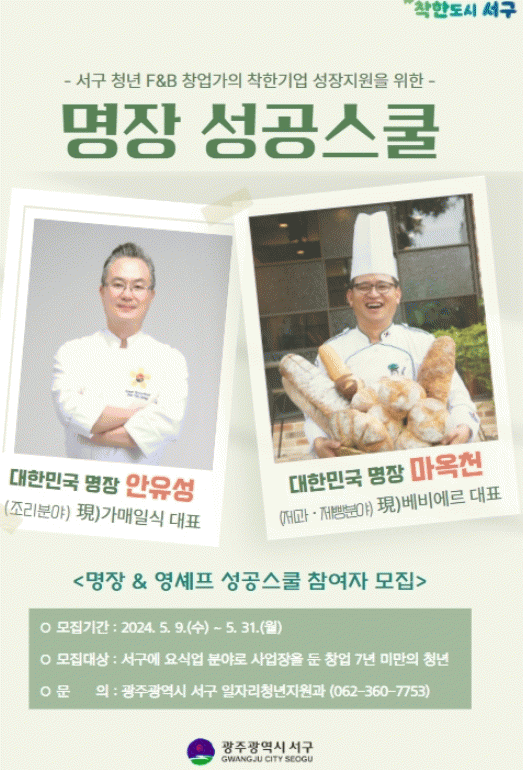 서구는 대한민국 명장인 마옥천 명장(제과·제빵 분야, 베비에르 대표), 안유성 명장(조리 분야, 가매스시 대표)과 함께 청년 창업가들의 레시피를 고도화시키는 1:1 맞춤형 프로그램 ‘명장 성공 스쿨’을 처음 선보인다.