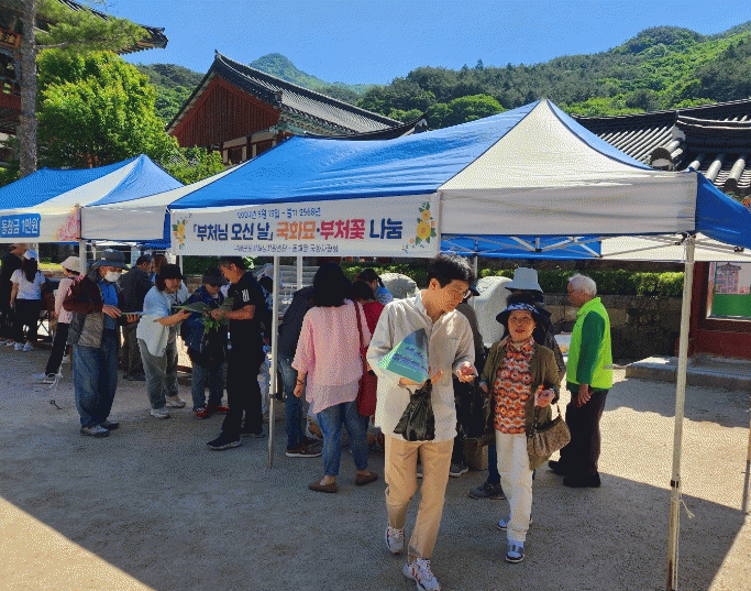 이번 나눔 행사에 사용된 꽃은 구례군도시재생지원센터와 꽃채운국화사랑회 회원들이 함께 육묘했다. 부처꽃은 부처님께 연꽃 대신 공양한 꽃이라고 알려졌으며, 골잎원추리와 노란색의 화사하고 소담한 소국 등은 노고단에 자생하는 꽃이다.
