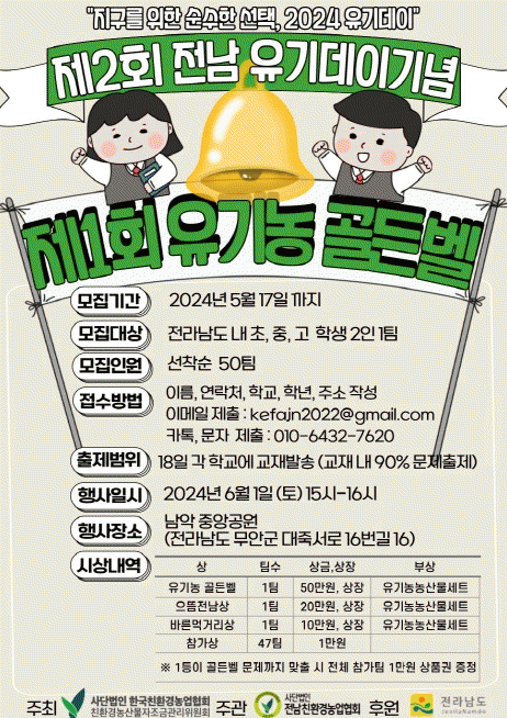 특히 새롭게 기획한 전남 초·중·고 학생 2인 1팀으로 50팀이 참가하는 유기농 골든벨 퀴즈대회, 지난해 인기가 많았던 청소년 춤 경연대회를 열어 미래 소비자와 가족 단위 방문객 참여 기회를 높일 예정이다.