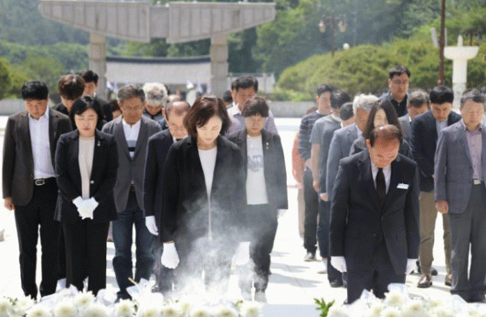 인재근 국회의원, 유은혜 김근태재단 이사장, 신수정 광주·전남지부 운영위원장 그리고 김근태재단 광주·전남지부 회원들과 함께 묘역을 참배한다.