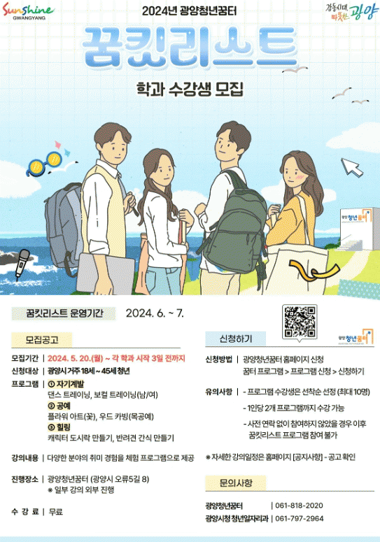 자세한 내용 및 일정은 광양시청 홈페이지 공고 또는 광양청년꿈터 홈페이지에서 확인할 수 있다.