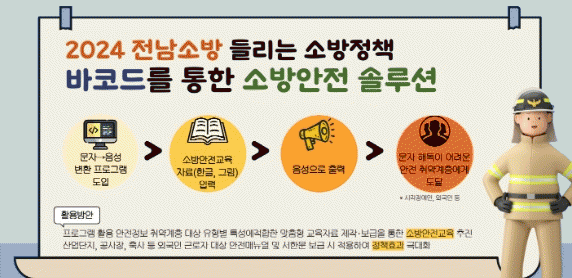 바코드는 소프트웨어 활용을 통해 문자 해독이 어려운 시각장애인과 외국인 등을 대상으로 텍스트(문자)로 된 소방 안전교육 자료를 음성(한국어, 외국어)으로 출력이 가능하다.