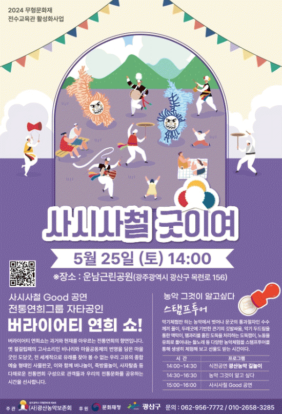 ‘사시사철 굿이여’는 공연, 체험, 교육 등으로 유네스코 세계무형유산인 농악을 다방면으로 알아보는 프로그램이다. 문재청과 광산구가 주관하는 ‘2024년 무형유산 전수교육관 활성화 지원사업’의 하나다.