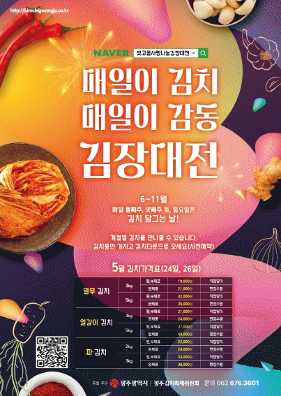 광주광역시는 23일부터 26일까지 광주김치타운 다목적체험관 등에서 ‘매일이 김치! 매일이 감동!’이라는 주제로 ‘봄 햇김치 사랑나눔 행사’를 연다.