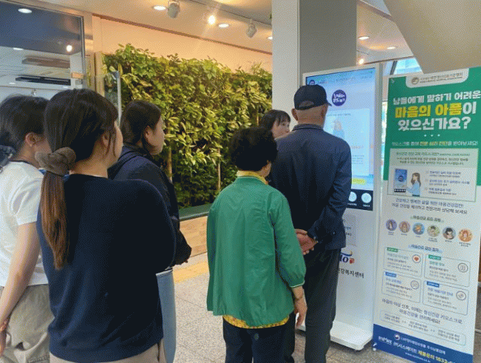 정신건강 키오스크는 청소년, 성인, 노인 등 대상자별 우울증, 스트레스, 불안장애 등의 정신건강 상태를 자가 검진할 수 있고 결과를 카카오톡으로 바로 전송할 수 있다.