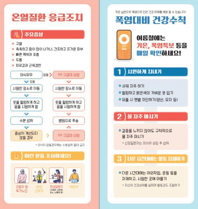 특히, 열사병은 체온조절 중추신경이 기능을 상실해 체온이 40℃ 이상으로 상승하는 위험한 질환으로, 즉시 119에 신고한 후 체온을 낮추는 응급조치에 들어가야 한다.