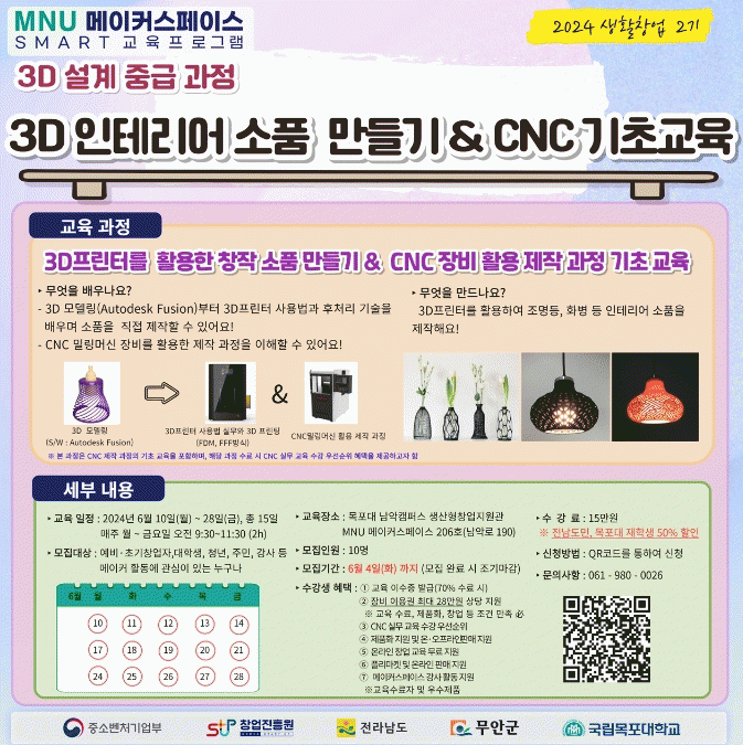 해당 과정은 오는 6월 4일까지 MNU메이커스페이스 홈페이지에서 학생, 청년, 예비·초기 창업자 등 메이커 활동에 있는 주민 누구나 신청할 수 있으며, 전남도민 또는 목포대학교 재학생은 수강료를 50% 할인받을 수 있다.