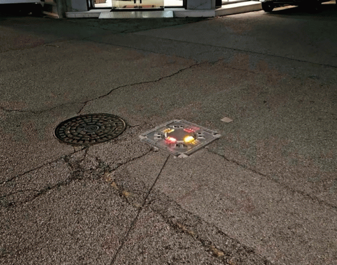 ‘교차로 알림이’는 이면도로 교차로 내 야간 통행 시 마주 오는 차량을 인식해 불빛으로 통행환경을 안내하는 시설물이다.