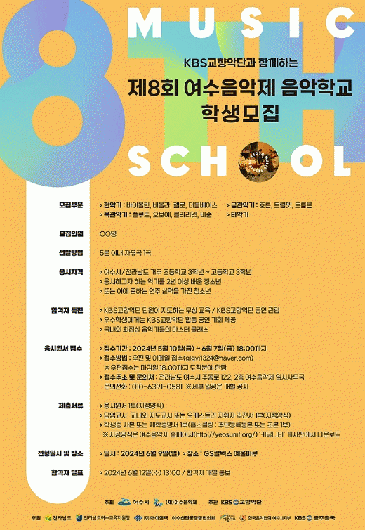 합격자에게는 6월부터 10월까지 ▲KBS교향악단 전?현직 단원의 개인 및 단체 수업과 ▲여수음악제 폐막 연주회 협연 ▲국내외 최정상 음악가들의 마스터 클래스 등의 다양한 교육 특전이 주어진다.