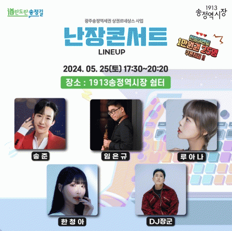 같은 날 오후 5시 30분부터 1913송정역시장 쉼터에선 약 3시간 동안 ‘난장콘서트’가 열린다. 색소폰 연주가 임은규, 트로트 가수 송준, 루아나, 한청아의 공연부터 EDM(이디엠, 일렉트로닉 댄스 뮤직)?댄스 그룹 DJ(디제이)장군, 일브로, 클락션의 신나는 무대가 이어진다. 난장콘서트에서도 관람객 대상 쿠폰 지급 현장 이벤트를 진행한다.
