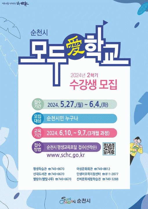 한편, 모두愛학교는 시민 누구나 배움을 통해 나눔을 실천하고 행복한 삶을 누릴 수 있도록 순천시민의 일상을 함께하는 평생교육 대표 프로그램이다.