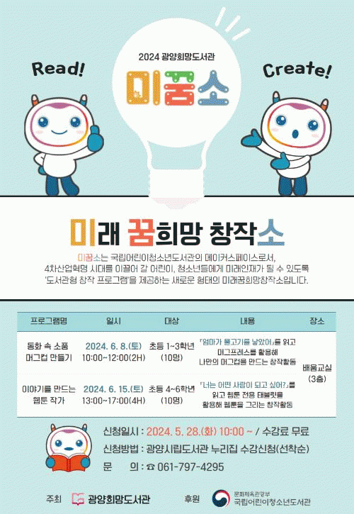 ‘미꿈소’는 국립어린이청소년도서관의 대표 브랜드로 독서에 창작활동을 접목시켜 융합적인 사고능력을 향상시킬 수 있도록 지원하는 사업으로, 전남에서는 광양희망도서관이 유일하게 선정됐다.