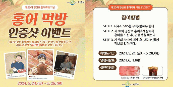 참여 방법은 우선 나주시 SNS(유튜브·인스타그램·페이스북·카카오채널 중 1개) 구독 또는 팔로우 후 홍어 먹방 인증 사진을 개인 SNS에 ‘전체공개’로 올리면 된다.