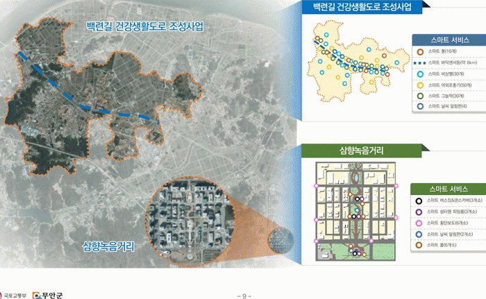 이번 공모사업에 무안군은 일로읍과 몽탄면, 삼향읍(신도심)에 조성 중인 산책로를 대상지로 선정하고, ‘교통문제, 군민 건강증진, 지역경제 활성화’에 대한 방안을 제시했다.