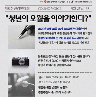 이번 대회는 5·18을 직접 경험하지 못한 청년들이 자신의 언어와 이야기를 통해 5·18이란 무엇이고, 오월정신이 어떻게 일상에 스며있으며, 또 이를 다음 세대에 어떻게 이어줄지에 대한 이야기를 전한다.
