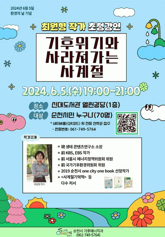 최원형 작가 초청 강연에 참여를 희망하는 시민은 네이버폼 또는 순천시 기후에너지과로 신청하면 된다.