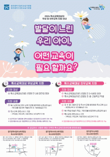 자료에는 ▲특수교육대상자 영아 무상교육 지원 절차 ▲특수교육대상자 유?초?중등 의무교육지원 절차 ▲2024학년도 유?초?중?고 입학 예정 학생 대상 특수교육대상자 선정·배치 안내 ▲자주 묻는 질문 ▲특수교육지원센터 위치 안내 등을 포함하고 있다.