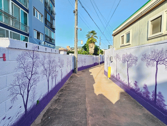 약 100M 길이의 보랏빛 골목갤러리는 보라색 톤의 나무 실루엣에 새·나비·잠자리·달팽이·두꺼비·도마뱀 등 다양한 생물들을 오브제로 입체감 있게 표현하여 이색적인 숲 분위기를 자아내고 있다.