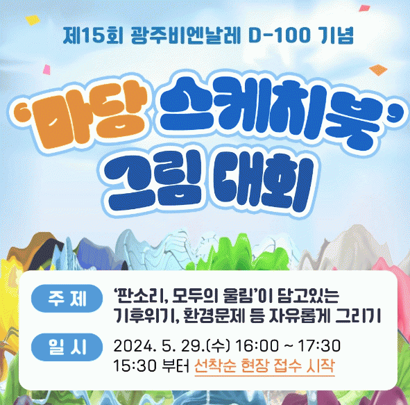 이번 대회는 비엔날레 광장 바닥을 정방형(1m×1m) 모양 100개의 캔버스로 나눠 제15회 광주비엔날레 주제인 ‘판소리-모두의 울림’이 담고 있는 기후위기?환경문제 등을 주제로 색분필을 이용해 광장바닥에 직접 그림을 그려 실력을 겨룬다.
