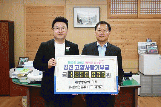 곽귀근 이사는 “고향사랑기부제를 통해 강진 발전에 직접 힘을 보태어 뿌듯하다”며, “고향에 대한 애틋한 마음을 전달할 수 있어서 매우 기쁘고, 앞으로도 전국에 있는 출향인들의 자발적인 기부가 지속되어 강진의 경제와 복지가 증진되길 바란다”고 말했다.