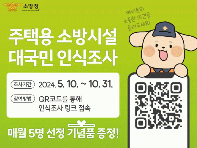 주택용소방시설 대국민 인식조사는 2024년 5월 10일부터 10월 31일까지 실시하며 아래 사진과 같이 QR코드를 통해 인식조사 링크를 접속하여 참여가 가능하다.