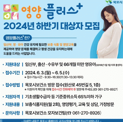 신청대상은 목포시에 거주하면서 빈혈, 저체중, 성장부진, 영양섭취상태 등 한 가지 이상의 영양위험요인을 보유한 기준중위소득 65% 이하 가구의 임산부와 출산?수유부, 66개월 미만 영유아이다.