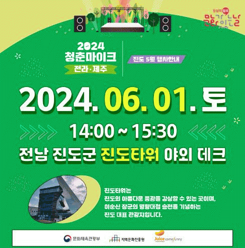 진도군 관계자는 “오는 주말 진도타워에서 가족, 친구, 연인과 진도의 멋진 풍경을 감상하며 청춘마이크의 즐거운 공연도 함께 즐기시길 바란다”고 말했다.