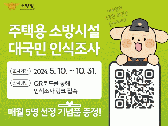 최진석 소방서장은 “주택용 소방시설은 소방차 1대 이상의 효과를 낼 수 있는 매우 중요한 소방시설이다”라면서 “국민들의 다양한 의견을 통해 더 좋은 홍보방안을 마련할 수 있도록 대국민 인식조사에 적극 참여 부탁드린다”라고 전했다.
