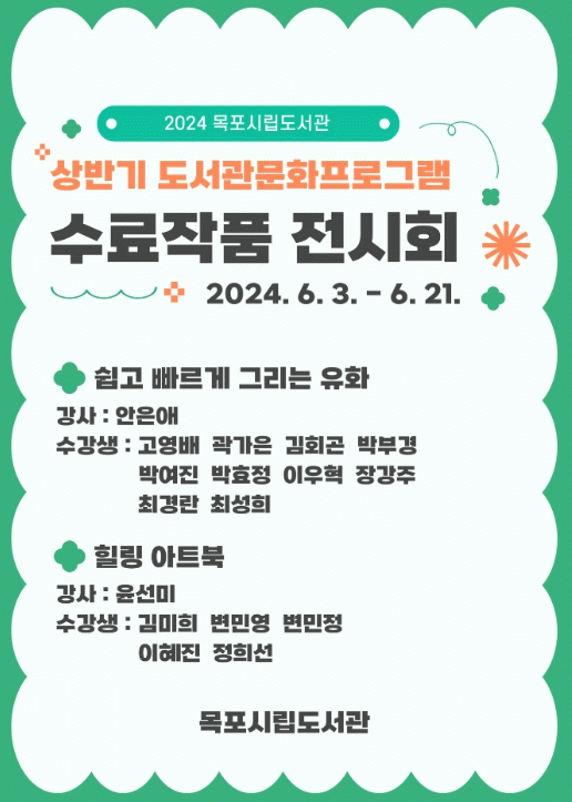 최진수 시립도서관장은 “목포시립도서관이 지역민을 위한 다양한 문화, 예술 강좌를 개발 운영하기 위해 항상 노력하겠다”며 “앞으로 진행될 도서관 프로그램과 행사에도 많은 관심과 참여를 바란다”고 말했다.