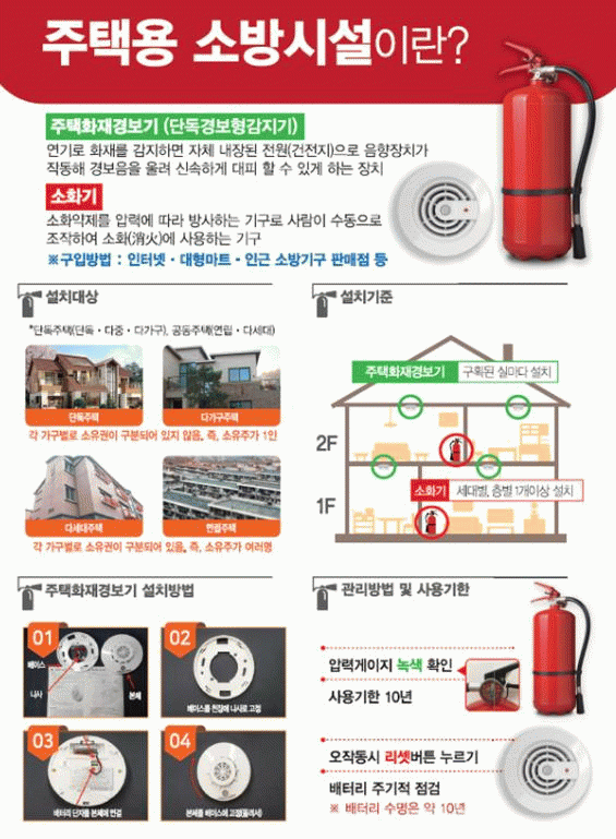 따라서, 화재 초기에 신속한 대응과 대피가 필요한 단독주택에는 주택용 소방시설(소화기, 단독 경보형 감지기) 설치를 해야한다고 적극 독려하고 있다.