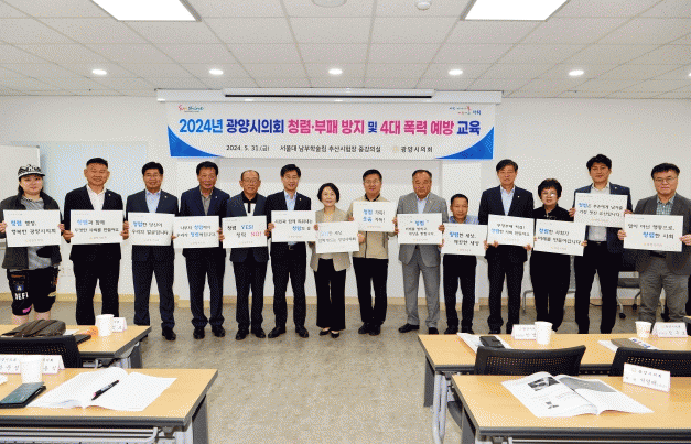 아울러 강의 후 진행된 청렴 실천 서약식에서 시의회 의원들과 직원들은 공정하고 투명한 직무수행을 다짐하고 부정부패를 근절하겠다는 의미를 담아 청렴서약서에 서명하고 퍼포먼스를 진행했다.