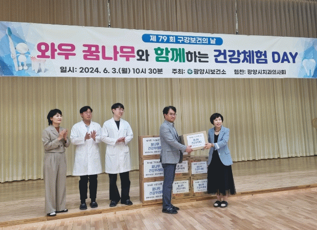 김태완 광양시치과의사회 회장은 학교 측에 꿈나무 건강꾸러미를 전달하며 “구강보건의 날 슬로건이 ‘우리 건강, 이(치아) 행복에서부터’로 체험활동을 통해 구강건강뿐만 아니라 신체적, 정신적, 생활 습관까지 학생 스스로 건강의 중요성을 생각하며 행복한 사람으로 성장하길 바란다”고 말했다.