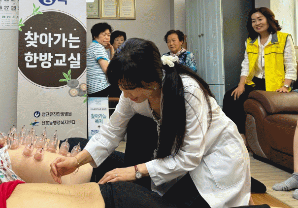 한의사가 매월 신흥동의 경로당을 방문해 한방침, 부항 시술을 비롯해 우울감 해소와 치매예방을 돕는다.