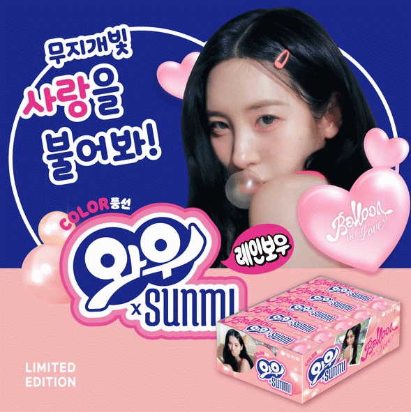 ‘선미껌’은 기존 와우껌 레인보우맛 제품에 신곡 ‘Balloon in Love’의 콘셉트를 담은 선미의 사진, 손글씨 가사 등으로 디자인된 콜라보 상품이다.