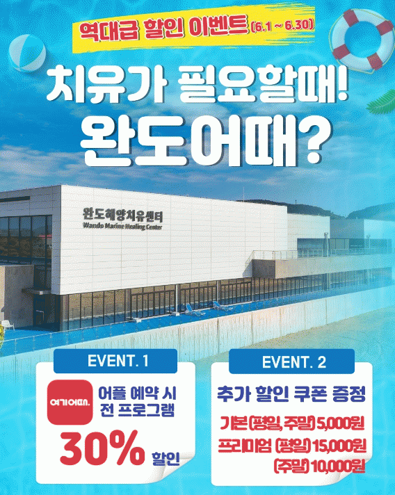 먼저 한국관광공사의 ‘웰니스 관광 체험 주간’을 맞아 6월 한 달 동안 국내 대표 온라인 여행 플랫폼인 ‘여기어때’를 통해 완도해양치유센터를 예약하면 전 프로그램을 30% 할인하는 이벤트를 추진한다.