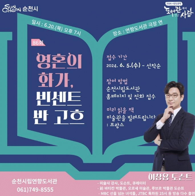 이창용 도슨트와 함께하는 시민인문학 강의 신청은 순천시립도서관 누리집을 통해 가능하며, 관심 있는 순천시민 누구나 신청할 수 있다.