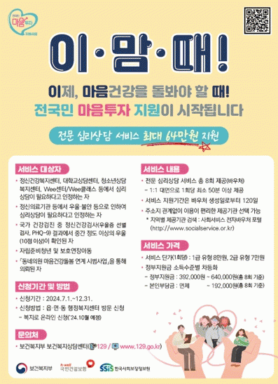 올해 첫 시행하는 ‘전국민 마음투자 지원사업’은 우울·불안 등 정서적 어려움이 있는 시민에게 심리상담 서비스를 제공, 시민의 마음건강을 돌보는 사업이다.