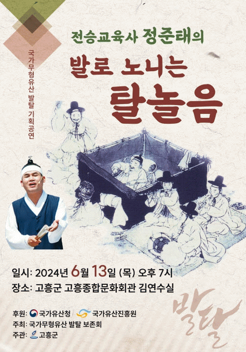 이번 공연은 국가유산청(舊 문화재청) 국립무형유산원이 후원하는 ‘2024년 전승자 주관 전승활동 지원사업’ 일환으로 진행되며, 국가 무형유산 제79호 발탈 전승 교육사이자 고흥군 전속예술단 판소리창극단 지도자인 정준태씨가 진행하는 공연이다.