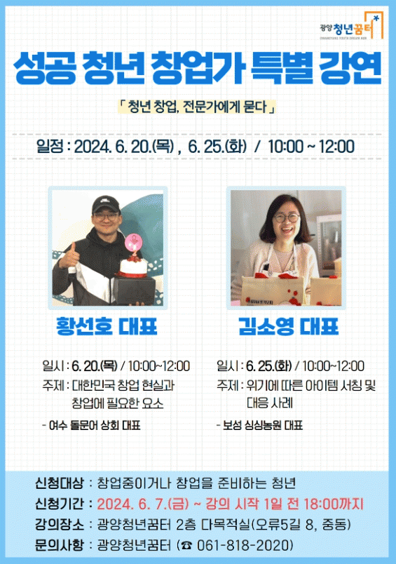 이번 특별 강연은 오는 20일 목요일과 25일 화요일 오전 10시에 2회에 걸쳐 청년꿈터에서 진행되며, 창업 초년생과 준비생을 대상으로 전라남도 내 창업에 성공한 선배 사업가들이 나와 자신이 직접 겪은 사례들과 창업에 관한 노하우를 이야기할 예정이다.