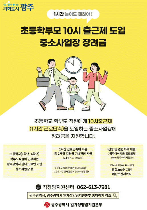 이 사업은 광주지역 중소기업에 재직하는 초등 학부모 근로자가 최대 2개월 간 임금 삭감 없이 근로시간 1시간을 단축할 수 있는 일가정양립 지원 사업이다.