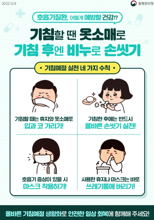 또한 백일해 등 호흡기감염병 예방을 위해서는 올바른 손씻기, 기침예절 실천, 실내에서 자주 환기하기, 호흡기 증상 있을 시 적절한 진료받기 등 예방수칙을 잘 지켜야 한다.